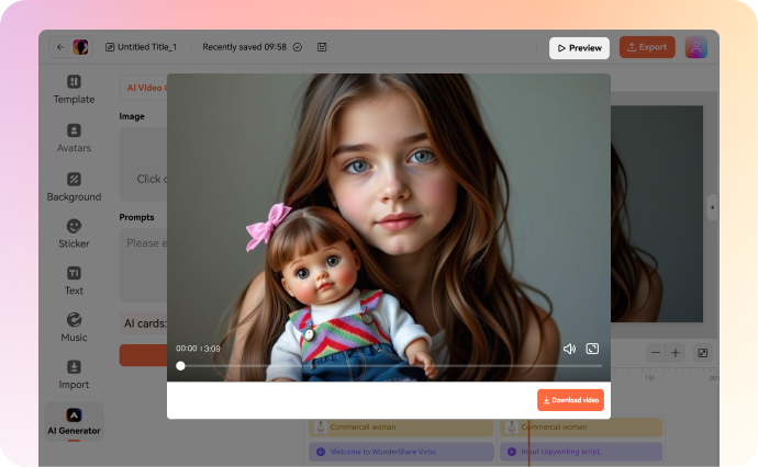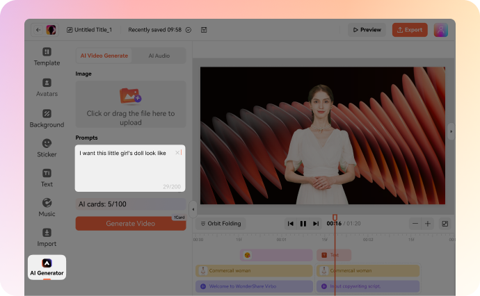 You can quickly generate AI doll images with Virbo AI. You only need to describe how you want your AI doll to look, then prompt the AI system to do the heavy lifting. The whole process should take just a few seconds.