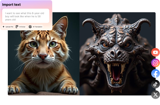 Using our AI monster generator can be a lot of fun. Whether you're a professional gamer or a casual storyteller looking to add new creatures to your next release, this tool can be what you need. For example, you can create a funny AI monster by merging two animals together. By the way, this approach is widespread on social media apps these days. Or, you can create giant monsters by building ancient Egyptian pyramids and other civilizations. Moreover, you can generate a monster gallery and put them on cards or posters. Our monster maker AI can really spice up your entertainment lifestyle.
